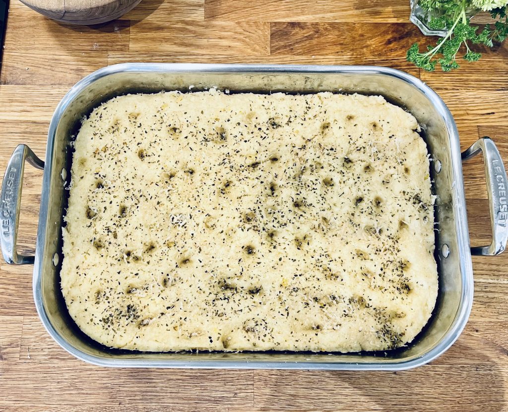 Une focaccia et trois sauces faites maison accompagnées de produits du terroir.